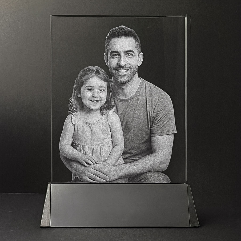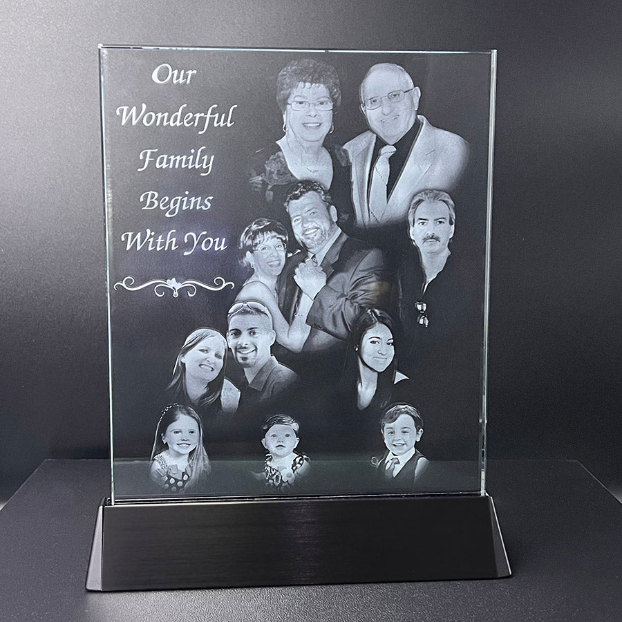 Available in multiple sizes and suitable for either vertical or horizontal orientation, each crystal fits seamlessly into a brushed metal light base that softly illuminates the engraving from below. The glowing effect brings depth and definition to your design, making this piece ideal for photos, awards, logos, or personal messages.