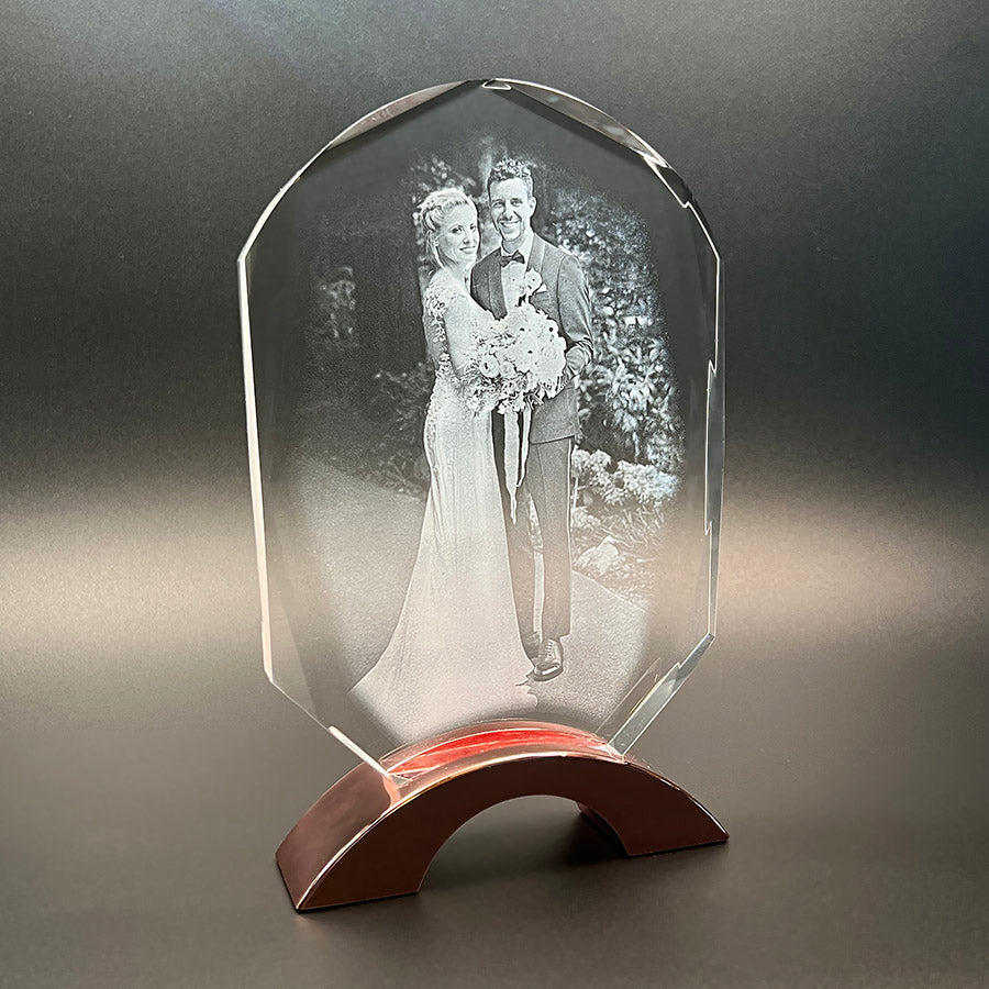 Brilliantly cut and beautifully balanced, the Jeweled Crystal with Alloy Base is a stunning way to showcase your favorite memories in luminous 2D or 3D detail. With its angled, faceted edges and arch base, this piece offers a refined modern silhouette that radiates light from every angle.